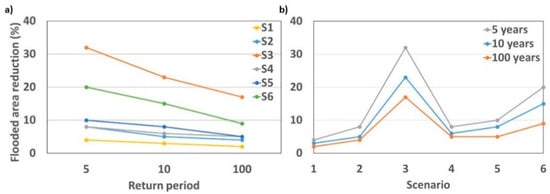 Figure 9 presents the variation in the percentage of flooded area reduction as a function of the rainfall return period and different NBS scenarios. For all scenarios, the reduction in flooded area is decreasing in the rainfall return period. This reduction is larger for scenarios S3 and S6 between 5 and 10 years, than 10 and 100 years (Figure 9a).