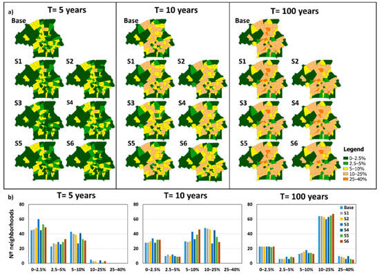 The spatial distribution of flooded area percentages for the baseline and NBS scenarios shows that higher percentages correspond mainly to areas that have mostly impervious surfaces (Figure 6 and Figure 10a). Flooded area distribution of scenarios S1, S2 and S4 are similar to the baseline; Scenarios S3, S5 and S6 present larger differences, with lower flooded area percentages in a larger number of neighborhoods as compared to the baseline (Figure 10). For the 5 years return period under the baseline and NBS scenarios, a flooded area percentage of less than 10% is expected in the city center (Figure 10a). Furthermore, as compared to the baseline, under scenarios S3, S5 and S6 there are significantly more neighborhoods with a smaller flooded area than there are neighborhoods with a larger flooded area (see Figure 10b).