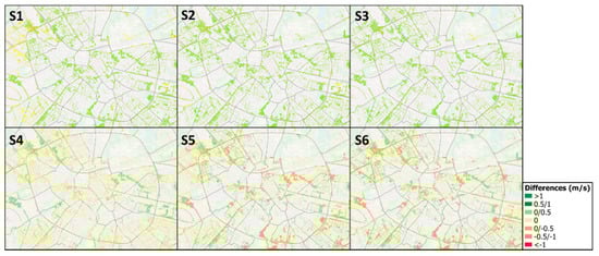 Differences in flood velocity under NBS scenarios (S1 to S6) relative to baseline for 100-year return period.