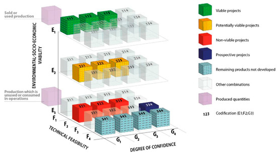 The following description is based on Reference [42] (p. 2): the UNFC is a ‘principles-based system in which products of a resource project are classified on the basis of three fundamental criteria: environmental-socio-economic viability (E), technical feasibility (F), and degree of confidence in the estimate (G), using a numerical coding system’. In a three-dimensional system (cf., Figure 1), these criteria are combined to classes with different categories (e.g., E1, E2, E3) and, where appropriate, to subcategories (e.g., E1.1). For that matter: