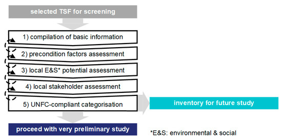 While investors seek economic benefits from a project, a lack of public acceptance can jeopardise project development. Therefore, a successful project implementation must include the interest of both investors and the public. In this context, a systematic approach was developed to quickly identify project potentials and barriers in 5 steps (cf., Figure 2, elaborated in Section 3.2, Section 3.3, Section 3.4, Section 3.5 and Section 3.6). The approach implements the discussion results of Section 2.3 which stipulate to consider the principles of natural and anthropogenic mineral RMs assessment in TSF assessment. After the initial collection of basic information, the order of the steps reflects an increasing effort to obtain information. Therefore, the collection of information can be interrupted before too much time and money are invested. A reiteration of each step can be performed if it is decided that more information is necessary or when new information on preceding steps becomes available. Table 2 shows an overview of the knowledge generated in each step, as well as general criteria for the case of a positive rating of each step.