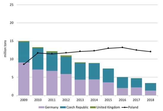 For years, Poland has remained the largest producer of high-quality coking coal in the European Union [,] and one of the leading producers of coke (based on domestic coking coal) used in steel melting. Apart from Poland, coking coal is only exploited in the Czech Republic (Figure 1), and among European countries outside the EU—in Russia and Ukraine []. Its exploitation in Germany was completed in 2018 []. According to World Mining Data [], annual coking coal output in the EU has seen a steady decline from 25 million tonnes to 15 million tonnes between 2010 and 2018. In Poland, throughout the analyzed period it remained at a similar level of about 12 million tonnes annually, constituting in recent years almost 80% of total output in the EU countries (Figure 1). At the same time, it is estimated that community demand for coking coal in the analyzed period averaged 50 million t/y [], and Poland satisfied ¼ of that demand. The deficit in coking coal on the EU market was met by imports mainly from Australia, USA, Canada, and Russia, and in recent years from Mozambique [,]. The level of these imports is likely to increase due to the eventual phasing out of Czech coal mines.