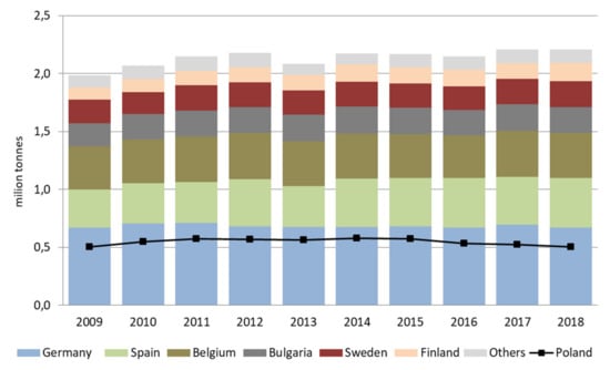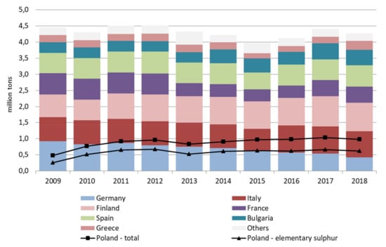 In the analyzed decade Polish sulfur export remained in the range of 400,000–580,000 t/y, being directed to many recipients in the world, with the biggest share to Morocco—one of the biggest sulfur consumers in the world (57–83% of sales), but also Brazil, the Czech Republic, Germany, Finland, and Slovakia [,]. The total volume of sulfur exported to EU countries was relatively low in the analyzed period and amounted on average to 67,000 t/y, but it is worth mentioning that it has been clearly increasing in recent years.
