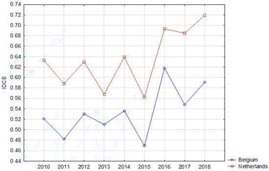 In a further analysis, the significance of trends for the development indicators of the analysed countries in 2010–2018 was verified. The analysis allowed the investigators to establish significant growing trends for IDCE only in the case of two countries, i.e., Belgium and the Netherlands at significance level α = 0.1, while no significant trends were established for the other countries (Figure 1).