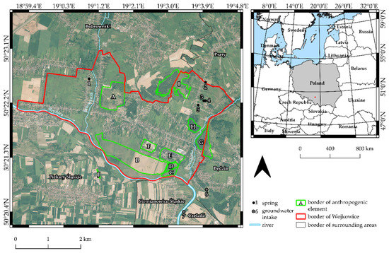 Location of Wojkowice in Europe. Spring: 1—Spring “Stara 107”, 2—Spring “U Wnuka”, 3—Spring “Brzeziny”, 4—Spring “Spod morwy”, 5—Spring “Długosza 36”, 6—deep well “Rozkówka R-1”, 7—deep well “Przełajka-3”. Anthropogenic elements: A—Limestone quarry of the “Saturn” Cement Plant, B—Collective Farm “Przyjaźń”, C—Waste tip no. 2 of “Jowisz” Coal Mine, D—Waste tip no. 1 “Jowisz” Coal Mine, E—Post-industrial areas of “Jowisz” Coal Mine, F—Post-industrial areas of “Saturn” Cement Plant, G—Sub-surface waste tip of “Grodziec” Coal Mine, H—“Uciekaj” Bootleg Mine, I—Limestone Quarry of “Grodziec” Cement Plant, J—“Dąbrówka” Zinc and Lead Mine [39,40].
