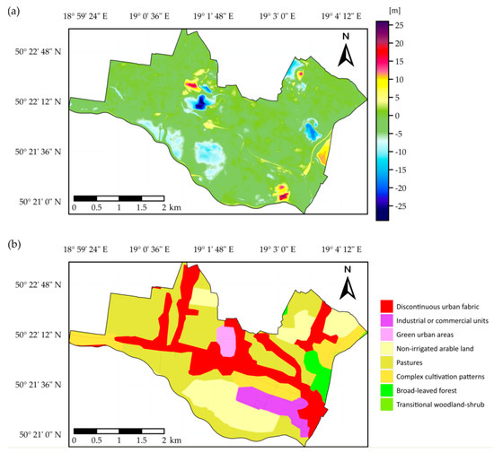 (a) Differential model of Wojkowice relief; (b) Contemporary model of ground cover of the Wojkowice area from CORINE Land Cover 2018 [43].