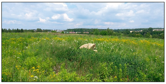 Concerning shrub communities, in the north-east of the town, a small fragment of agricultural landscape has been preserved where a natural fringe community and thickets from the class of Rhamno-Pruneteae and the order of Prunetalia spinosae grow. These are dominated by xeromorphic shrubs such as Prunus spinosa, Rhamnus catarcticus, Crataegus monogyna, Rosa canina and often Corylus avellana. This community is scattered throughout the area, mainly in unused agricultural areas on the quarry’s outskirts in “Żychcice–Saturn” and post-limestone pits (Figure 1) or other hills on the town border. These communities also create habitats for many organisms associated with open areas and inhibit soil erosion processes.