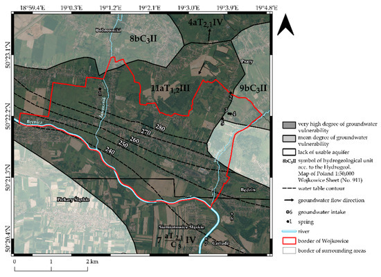 Location of the research points according to the Hydrogeological Map of Poland 1:50,000, Wojkowice Sheet (No. 911) [38].