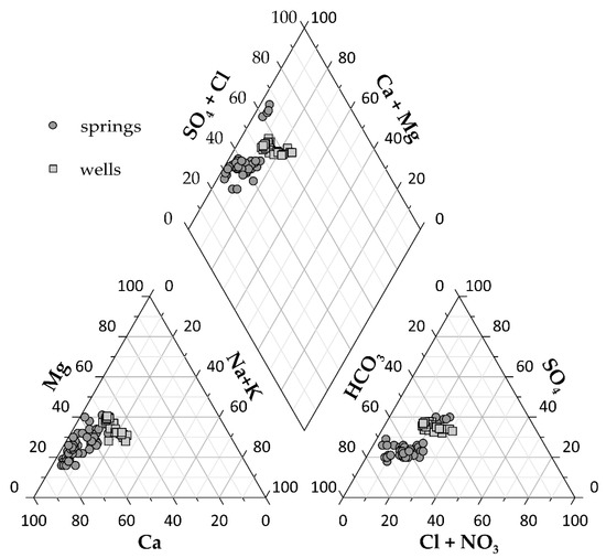 The waters of the springs examined from 2015–2019 were usually characterized by lower mineralization (EC 493–1117 μS/cm), except for the waters of the “Długosza 36” spring (up to 1580 μS/cm); they are slightly acidic to slightly alkaline (pH 6.50–8.30), usually hard and very hard (total hardness 335–650 mg CaCO3 L−1), and all of the HCO3-SO4-Ca-Mg type. The concentrations of the tested components were in the ranges (mg/L): Ca 66–182; Mg 9.6–52.8; Na 2.2–47.2; K 0.6–10.5; HCO3 113–529; SO4 61.3–201; Cl 5.3–88; NO3 4.6–73.1; PO4 0.02–0.2; SiO2 3.6–9.8 (Table 2, Table S3).