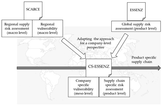 The company-specific ESSENZ method developed in this paper (hereafter referred to as CS-ESSENZ) identifies potential points of criticality within a company’s supply chain for a specific product. It extracts the results generated with ESSENZ and complements these results with data from SCARCE’s vulnerability measurements, using company-specific data along the supply chain as well as for its vulnerability (see Figure 1). This way, the method can reveal areas where a company can improve its position with respect to criticality and enable it to increase the transparency of its supply chains.