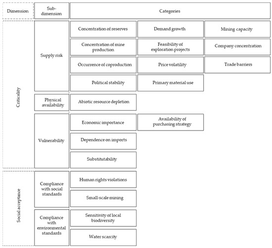 Various factors and dimensions are relevant in this context. The environmental and the social dimension are most prominent among society as a whole, but as mentioned above, the economic sustainability of a supply chain has become increasingly relevant for both companies and countries (e.g., [10]). On the one hand, companies need to be aware of the potential supply risks they are facing, and on the other hand, they need to measure the economic impact of those risks (this economic aspect is referred to in the literature as “vulnerability”). This combined assessment of a resource’s supply risk and economic importance is referred to as its “criticality” [10]. Measuring these factors is essential for making informed economic and political decisions.