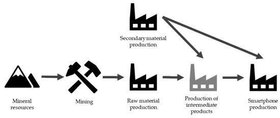 The case study uses a hypothetical German smartphone-producing company for analysis. The model assumes that the company produces only smartphones, and exclusively of one type. The functional unit of the case study is a single smartphone ready for customer use. The processes from the mineral resources to the production of the product are included (see Figure 3), as these processes are part of the company’s supply chain. The resources used for infrastructure, transportation, energy, and heat production are not considered. The BoM is based on a literature review including papers on older technologies. Therefore, elements that are no longer allowed to be used, such as lead [41], are still included in the BoM, while other commonly used elements, such as silicon and lithium, are not included. Nevertheless, this does not undermine the goal of this paper, which is merely to demonstrate the applicability of the method. The comprehensive BoM, as well as the supplying countries, share of supply by country, demand growth, recycling content in production, and criticality for the functionality of the phone, are presented in Section S2, Table S2 of the Supplementary Materials.