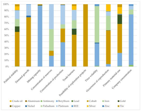 The results for supply risk are displayed in Figure 4, where the aggregated results for each category of materials are set to 100% (for more details, e.g., on physical availability, compliance with social standards, and compliance with environmental standards, see Section S3 of the Supplementary Materials). It shows which material has the highest relative result within a category. Within the categories of political stability, demand growth, trade barriers, feasibility of exploration projects, occurrence of coproduction, and primary material use, cobalt has the highest impact. Cobalt is primarily mined in the Democratic Republic of Congo (Dem. Rep. Congo), which contributed about 56% of the worldwide production in 2015 [46]. The political situation in the Dem. Rep. Congo is highly unstable due to political conflicts that officially ended at the beginning of the 21st century (e.g., the Second Congo War) but continue to have an impact [47]. Thus, the country’s trading environment is unstable. Beryllium is the element most profoundly affected by mining capacity and company concentration, as the majority of beryllium is mined in the USA by one company [48]. Concentration of reserves is mainly driven by palladium and platinum. About 95% of the world’s platinum group metal reserves are in South Africa [48]. For price volatility, palladium has the biggest impact. The concentration of production is the highest for beryllium and platinum.