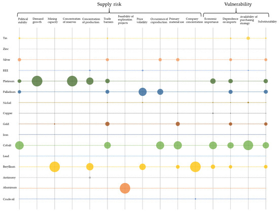 The resulting hotspots were further evaluated with CS-ESSENZ by applying the CS-ESSENZ CFs (as presented in Section 3). This enabled a company-specific evaluation of the product to be achieved, since the CFs are based on company data. In addition, vulnerability is evaluated for all elements of the BoM. Figure 5 shows the CS-ESSENZ results for criticality (vulnerability and supply risks). The bigger the circle in the figure, the higher is the hotspot of the element-category combination. No circle means that the result is at least as good as the company-specific target values (e.g., crude oil and feasibility of exploration projects) or that no hotspot was identified with ESSENZ (e.g., gold in demand growth). The element-category combinations evaluated with CS-ESSENZ are listed in Table 3.