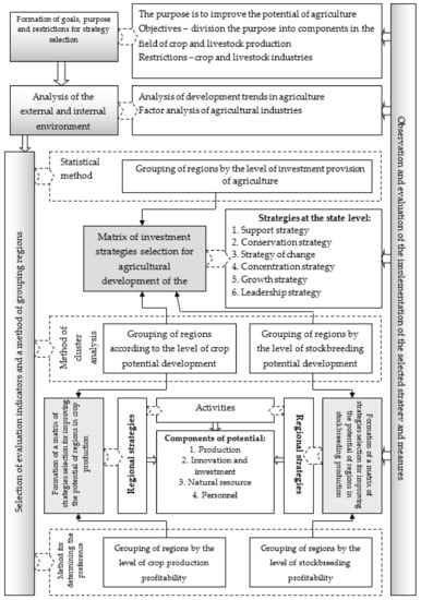 The deliberations presented allow us to propose a scientific and methodological approach to the formation and selection of strategies to improve the agricultural potential of regions (Figure 2).