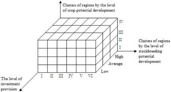 The matrix method of strategy selection has been widely used in strategic management since the 1960s. Its advantage is that it allows the choice to be made when concurrently taking several parameters into account. The most common are two-factor matrices: the Boston Consulting Group (BCG) matrix to analyze growth rates (growth) and market share [], the General Electric McKinsey matrix to analyze market attractiveness and competitiveness [], the Arthur D. Little matrix (ADL/LC) for the analysis of the life cycle of the industry and the relative state of the market [], the “Product–market” matrix (Ansoff matrix) for the choice of strategy for markets and goods [], etc. The advantages of the matrix method are simplicity, clarity, and the possible dynamic mode, while a disadvantage is that only two parameters are taken into account. In order to take the three parameters that are investigated in the study into account, a 3D matrix is proposed. Based on the cluster analysis of the regions of Ukraine by the level of development of crop and stockbreeding potential and their grouping by the level of investment provision of agriculture, a 3D matrix for the selection of an investment strategy for agricultural development in Ukraine was built (Figure 3). The X axis shows clusters of regions according to the level of development of crop potential, the Y axis shows clusters of regions according to the level of development of stockbreeding potential, and the Z-axis shows groups of regions according to the level of investment provision for agriculture.