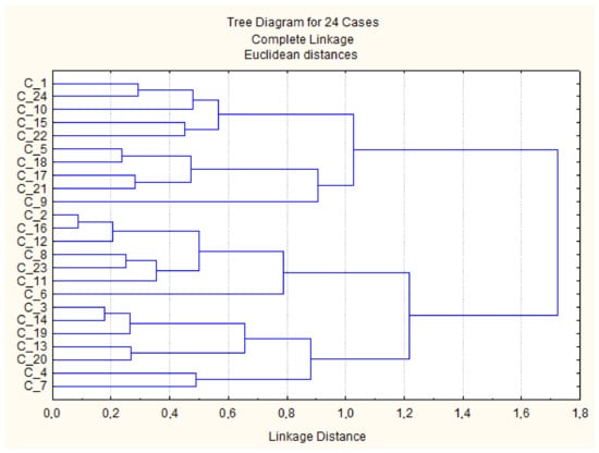 The abovementioned advantages of using cluster analysis explain its wide application in various fields: geography, biology, statistics, psychology, economics and other social sciences [,,]. Cluster analysis is often used to group enterprises or regions according to a set of socio-economic indicators. A study of the literature showed that it was used by scientists to determine the clusters of small and medium-sized enterprises operating in the Slovak Republic and the use of marketing communication tools in the future [], to identify groups of Russian regions with similar family problems [], to assess the selected structural aspects of regional competitiveness and their role in identifying regional imbalances at the level of self-governing regions of the Slovak Republic [], to group the united territorial communities of Zaporizhzhia region with similar rates of economic development [], etc.