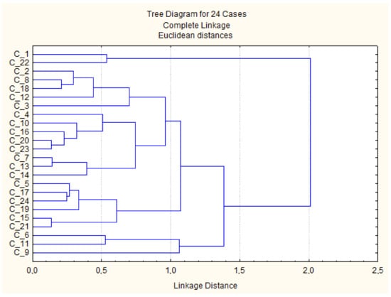 Classification of multidimensional observations or objects is based on the definition of the distance between the studied objects. The most common is the Euclidean distance [,]. This distance between the objects j and k is a geometric distance in multidimensional space and is calculated by the formula: