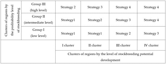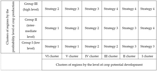 It is proposed to select strategies for improving the agricultural resource potential of the country’s regions using a methodology that, unlike others, is based on comparing clusters of regions and groups formed by the profitability of crop and stockbreeding production and the investment level in agriculture. The advantage of the proposed method is that cluster analysis involves the multidimensionality of statistical research, which includes collecting data about sample objects and organising them into relatively homogeneous groups. Cluster analysis is a means of grouping multidimensional objects and differs from conventional grouping in that each cluster contains similar objects that differ sharply from objects of other clusters. Grouping of regions according to the profitability of agricultural products and the level of investment provision of agriculture will allow the collection of necessary, reasonable and timely information as well as to monitor the state of and opportunities for agricultural development of each region. This, in turn, will enable the selection of the optimal strategy for each region.