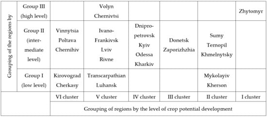 Table 5 shows the division of the regions of Ukraine into six clusters according to the level of development of crop potential based on 2018 data.
