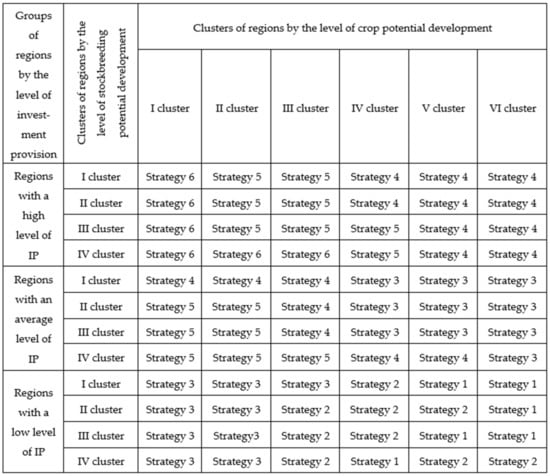 The agricultural sector is one of the leading ones in the economy of many countries, as it creates the basis for their economic growth. Every region in every country has its own unique sphere of social reproduction due to different resource potential, i.e., fertile soils, favourable climatic conditions, etc. Under such conditions, it is irrelevant to choose a single development path for this sector. Given these facts, the study formulates development strategies for regional agricultural development of the country. In particular, we grouped regions into clusters according to the level of development of crop production and stockbreeding potential, as well as investment attractiveness. The method of cluster analysis was used to group regions by the level of capacity development, whilst the matrix method was used to formulate a matrix for choice of the strategy to improve the agricultural potential of regions. On the basis of the conducted analysis, the 3D matrix for the choice of investment strategy of the regional agricultural development of the country depending on the level of development of crop production and stockbreeding potential and investment attractiveness was constructed.
