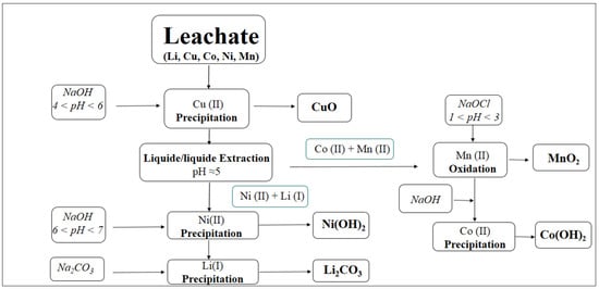 The first step is to recover copper by adding NaOH, under conditions of pH < 6 as it is presented in Figure 2. Then, cobalt and manganese are separated from nickel and lithium by liquid/liquid extraction. As an example, Cyanex 272-(organophosphinic acid) is the most widely used solvent extraction for the cobalt and nickel separation [31]. It has a very high selectivity allowing the efficient treatment of solutions with high nickel sulfate content and low cobalt content [32]. Subsequently, according to simulations, it is possible to separate cobalt/manganese by precipitation. However, it will be complicated to consider it experimentally. In fact, locally in the reactor, at the place where the NaOH is introduced, the pH is very high. As a result, cobalt and manganese co-precipitate, despite the homogenization of pH throughout the reactor. Then, an alternative solution to cobalt/manganese separation consists of an oxidative precipitation of manganese by NaOCl. Oxidative precipitation is an interesting alternative to a conventional precipitation, provided that it is within a specific pH and potential range to the selective precipitation of manganese oxide. For a potential range between 1.0 and 1.2 V (vs Standard hydrogen electrode) and a pH between 1 and 3, cobalt remains in the soluble Co2+ state while the stable form of manganese is solid MnO2. Indeed, in the pH range between 3 and 4 and in the same potential range, cobalt predominates as Co(OH)3 or Co2O3, 3H2O [33]. After that, cobalt is recovered by adding NaOH solution, pH range will be related to the polymorph aimed to precipitate: α-Co(OH)2 or β-Co(OH)2. As for nickel, it is precipitated in the same way at a pH between 6 and 7. Lithium is recovered by the addition of sodium carbonate as mentioned in the literature [34], until saturation and crystallization of lithium carbonate.
