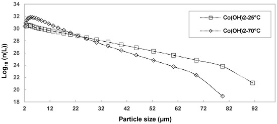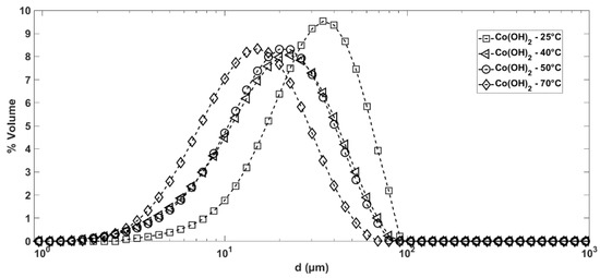 Concerning temperature’s influence on particle size distribution, experimental results show that increasing the temperature results in smaller particles of β-Co(OH)2 as shown in Figure 5. Indeed, at 25 °C, the cut-off diameter (d50) of Co(OH)2 particles is about 30 µm. In comparison, this diameter decreases by 55% at 70 °C, as d50 = 13 µm. However, this decrease varies slightly between 40 °C and 70 °C, with a particle cut-off diameter of about 16 μm.