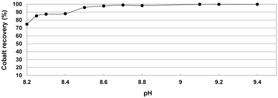 The experiments were conducted in a pH range between 8.2 and 9.4, corresponding to a molar ratio n OH−/n Co2+ < 2. The experiments showed that for a molar ratio lower than 2, cobalt (II) hydroxide of type α-Co(OH)2 is formed. Indeed, supersaturation is not sufficient for the rapid polymorphic transition from α-Co(OH)2 to β-Co(OH)2 [40]. Studies have shown that for a molar ratio n OH−/n Co2+ between 1 and 1.8, the polymorph α-Co(OH)2 remained stable, its conversion to the β-Co(OH)2 form is very long. Experimentally, the cobalt (II) hydroxide precipitation under these conditions leads to a polymorphic transition of up to 70 h. On the other hand, for a molar ratio greater than or equal to 2, α-Co(OH)2 transforms quite rapidly into β-Co(OH)2 [36], a transition time of about two hours has been observed. Thus, it is interesting to study the behavior of α-Co(OH)2 in a continuous regime and in a varied pH range, which depends mainly on the molar ratio n OH−/n Co2+ < 2. This study will allow the determination of the optimal pH that will meet the criteria of yield and filterability. The results in terms of cobalt recovery yield as a function of pH are shown in Figure 7.