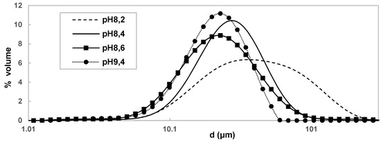 It appears that the cobalt recovery yield at pH 8.3 is around 90%. The recovery is not total because this pH corresponds to a molar ratio n OH−/n Co2+ of 1.1, which is not enough to recover all cobalt in solution. Thus, the total precipitation of cobalt starts from pH 8.6 where 98% of cobalt is in α-Co(OH)2 form. Cobalt is recovered totally in a pH range between 8.6 and 9.4. It should be noted that in this range, the molar ratio n OH−/n Co2+ is between 1.3 and 1.6. It is useful to note that the solid formed under this pH condition could correspond to a Co(OH)x; 1.3 < x < 1.6 form, due to the α-Co(OH)2 hydrotalcite structure, which mean the quantity of soda used is reduced, which is quite promising in economic point of view. From a particle size point of view (Figure 8), it appears that the pH increase causes a decrease in the median particle diameter of the Co(OH)2 particles. Indeed, for a pH of 8.2 the median diameter is 42 μm ± 1.5 μm and it increases to 23 μm ± 0.04 μm for a pH of 9.4.