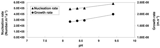 In terms of filterability, at pH = 9.4, filtration takes place at a flow rate of 100 mL.min−1 compared to 33 mL min−1 at any other pH. The filtration rate is three times higher. In addition, the polymorph control is a major issue. Comparing the different nucleation rates, it appears that in a range of pH < 9.4, nucleation rates increase, as shown in Figure 9.