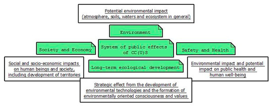 Basing on the “World Bank Group Environmental, Health, and Safety Guidelines” [102], we supplemented the above directions (EHS) with such aspects as society and economy, long-term ecological development, as the EHS addresses organizations’ environment and labor activities, while we study the overall impact of CC(U)S on public, including socio-economic (SE) effects and environmentally oriented development (ED). We called the system EHS/SE and ED (Figure 2).