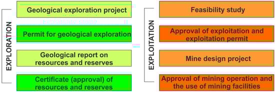The general procedure for exploration and exploitation of the new mine/quarry is divided in four steps: geological exploration, approval of exploitation, approval of execution of mining operations, and approval for the use of mining facilities (Figure 2).
