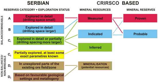 Serbia is, therefore, one of several Central and Eastern European countries where a derivation of the older, non-CRIRSCO-aligned Soviet state system is used. There is always a question about how to compare the exploration results in such cases and there were several proposals about how to do this directly, or “automatically” [,,]. The comparison between Serbian reserves according to the still valid legislation and the CRIRSCO based reporting system is presented in Table 6. In the Serbian classification, as in the whole former Yugoslavia, Soviet and Russian category P is named category D. Serbian reserve categories A, B and C1 may correlate either with measured and indicated resources if the analysis of modifying factors was not performed or is negative, or may correlate to mineral reserves if feasibility study is positive.