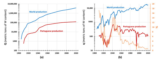 (a) Cumulative tungsten production in Portugal and worldwide over the 1910–2020 period; (b) annual tungsten production in Portugal and worldwide from 1910 to 2020; the percentage of the Portuguese input to global production is indicated by the broken dashed-line in orange. Data in Table S1 of Supplementary Materials.