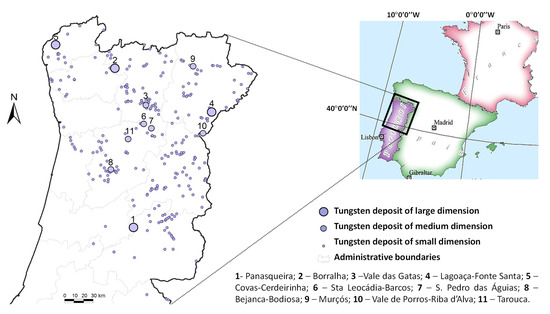Spatial distribution of the known tungsten deposits in Portugal mainland, according to the Information System of the Portuguese Mineral Occurrences and Resources (SIORMINP, [19]) managed by the Portuguese Geological Survey (LNEG). The 11 deposits listed in Table 2 are numbered as in the official maps provided by LNEG.