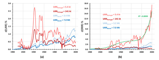 Making use of minimum values, i.e., the known reserves, the highest (>2%) rates were achieved in Portugal during 1940–1943 and 1951–1953, besides the year of 1957 (Figure 3a). With the exception of these periods, remained around 1.2–1.3% from 1938 to 1990, despite some occasional fluctuations, and from 1991 onwards, values dropped to 0.5–0.7%. This general tendency for decreasing with time in Portugal does not follow the consistent rising trend of depletion rates of world reserves from ≈0.3% in 1938 to ≈1.2% in 2020 (Figure 3a). As expected, similar conclusions can be drawn for the record of depletion rates referred to maximum values, i.e., the known resources, only lowering the absolute values in each year (Figure 3a).