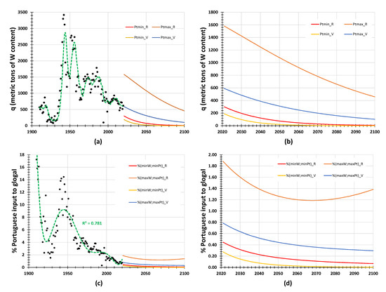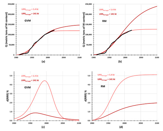 Forecasting of cumulative tungsten production in Portugal using curve-fitting models constrained by historical data (black dots) and maximum and minimum values (i.e., tungsten reserves and resources estimated for the country): (a) Generalized Verhulst Model (GVM); (b) Richards Model (RM). Variation of over time as predicted by results from GVM (c) and RM (d) approaches. For calculation purposes, the reference values are obtained by adding the historical cumulative production to current estimates of . Data in Table S3 of Supplementary Materials.