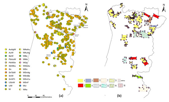 (a) Spatial distribution of the 385 tungsten-bearing specific tracts in Portugal mainland, considering the geographical coordinates and the geochemical association listed in the Information System of the Portuguese Mineral Occurrences and Resources (SIORMINP, [19]). (b) Vertices and centroids of selected polygons based on the exploration/exploitation areas granted by DGEG from 2007 to 2016. Colors and patterns of polygons indicate the relative importance of tungsten in the contract; the most significant surveys are those oriented to tungsten (yellow), tungsten-tin (red), and tin-tungsten (blue).