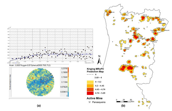 Despite the spatial point-density enhancement provided by the vertices and centroids of polygons, the low variability of persisted. Even so, an acceptable mean square relative error was obtained for simple kriging interpolation of “(higher)” data modelled with anisotropy (Figure 8a), thus considering the prevalent direction of regional geological structures. The mapped areas are plausible and fully consistent with the current knowledge about tungsten resources in Portugal, often coming along with tin and some other metals of economic interest (Figure 8b). Safeguarding the access to all these resources does not implicate more than ≈6% of the Portugal mainland territory.