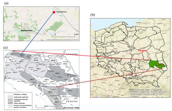 The study site is located in southeastern Poland in Czesławice (51°18′10″ N, 22°15′09″ E) (Figure 1a) in the Lublin Upland (Figure 1b), in the central part of the mesoregion—Naleczow Plateau (Figure 1c) [].
