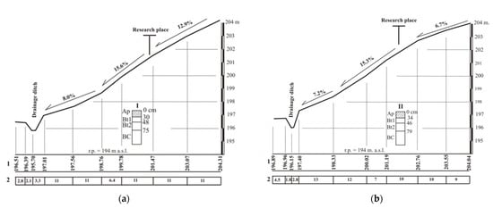 Soil samples for the study were collected in early May 2018 during the installation of the runoff capture devices. In both plots (experimental and control), one soil discovery was made each. The descriptions of the soil profiles were done in the field based on stratifying the distinguished diagnostic levels []. Soil samples were collected from each diagnostic level and determined according to recommended methods [,]: