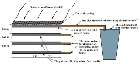 Methods described in Mazur [] were used to capture and test water from surface and intrasoil runoff. A schematic drawing of the runoff interceptors is shown in Figure 3. In May 2018, a catcher for the surface and subsurface runoff in the slope to a depth of 0.75 m was installed. The author’s catchers, structurally similar to a Gerlach catcher, was housed in the soil outcrop. Its volume was measured and taken in 1 L water bathymeters for laboratory analysis after the homogenization of the whole volume in the outflow presence. The content of suspensions in the collected water samples was determined according to Brański [], employing the gravimetric method, and the nitrogen (total, ammonium, nitrate, and nitrite), phosphorus, and potassium were determined by applying the photometric method []: