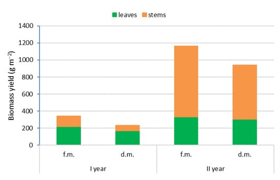 Yearly miscanthus plants produced a small aboveground mass averaging 340.21 g m−2 fresh matter (234.88 g m−2 dry matter). The dominant component of the yield was leaves, whose percentage share in fresh and dry matter was 64.45% and 72.41%, respectively. Miscanthus in the second growing year had a higher yield: an average of 1183.53 g m−2 fresh weight (939.14 g m−2 dry matter) and a stronger dominance of shoots, which accounted for 71.33% and 67.39% of the fresh and dry matter yield, respectively (Figure 4). Despite the end of the growing cycle, giant miscanthus was characterized by relatively high moisture content, especially of the stems, at harvest time. The average dry matter content in the first year was 69.38% in whole plants, 76.36% in leaves, and only 56.58% in stems, while in the second year, it was higher at 79.30%, 92.00%, and 76.33%. Similar data were presented by Clifton-Brown et al. [], who found that Miscanthus giganteus in the second year of vegetation developed a higher number of shoots, which gave a higher yield compared to the first year, and their moisture content was lower.