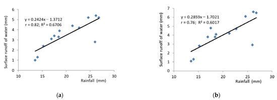 The variability of surface water runoff was 40% in the experimental plot (average variability) and 43.9% in the control plot (high variability) []. Surface water runoff from the experimental plot ranged from 1.0 to 5.4 mm (Table 7), accounting for 7.4% to 20.6% of the precipitation causing the erosion event. In the control plot, the runoff was higher, ranging from 1.1 to 6.6 mm, accounting for 9.3% to 25.2% of the precipitation. These rates were low compared to the maximum surface runoff on arable land, accounting for more than 40% of the precipitation causing an erosion event []. The experimental plot received a total of 45.6 mm of water column runoff during the study period, and the control plot received 52.7 mm. The study results show that not consistently high rainfall gives high surface runoff (Figure 5a,b). However, the obtained correlation coefficients r = 0.82 and r = 0.76 in the experimental and control plots, respectively (determination coefficients R2 = 0.67 and R2 = 0.60, respectively), show that the amount of surface runoff is very strongly correlated with the amount of precipitation. Studies conducted by Kim et al. [] and Zhang et al. [] demonstrated that several other factors, such as precipitation intensity, vegetation cover, and soil moisture, affect the amount of runoff. However, it is mainly the amount and intensity of precipitation that initiates surface runoff.