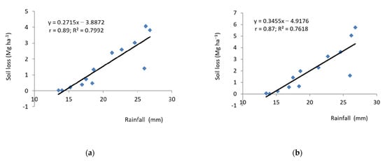 Soil loss in dependence on the rainfall amount; (a) experimental plot, (b) control plot.