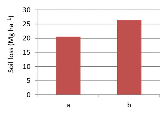 Soil runoff on the slope during single erosion events varied widely and ranged from 0.030 to 2.386 Mg ha−1 in the experimental plot and from 0.383 to 4.066 Mg ha−1 in the control plot. Studies conducted by Żmuda [] have shown that in root crops on the Trzebnickie Hills, the maximum surface soil washout during a single event can be as high as 60.132 Mg ha−1. However, in the study carried out by Rejman [] in the Lublin Upland, this value reached 20.640 Mg ha−1. During the study period, soil surface washout on the experimental plot was 20.510 Mg ha−1, while on the control plot, it was statistically significantly higher (about 29%) and amounted to 26.475 Mg ha−1 (Figure 7). The results of the research prove that the anti-erosion strip used reduced the leaching of soil from the slope and limited the development of modern morphodynamic processes. The results obtained from field tests regarding soil loss are difficult to relate to other results. This is due to differences in the inclination of slopes and soil conditions, but mainly due to the erosive nature of rainfall. Research conducted by Gil [,] showed that even the average ten-year size of soil loss can differ by up to 140% for cereal crops and 50% for potato cultivation.