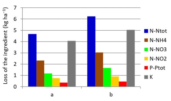 The Pearson correlation coefficients between nutrient losses (N-Ntot, N-NH4, N-NO3, N-NO2, P-Ptot, and K) and rainfall and surface water runoff were calculated (Table 9). The analysis of the relationship, at the significance level of α = 0.05, showed statistically significant correlations between the analyzed factors at the high and very high levels [].