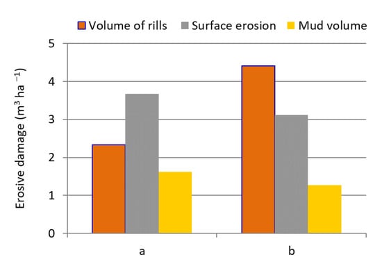 Under the conditions of the present study, the recorded erosion damages in the experimental plot in the form of rill erosion, surface erosion, and patches of deposited silt varied between 0.05–0.36 m3 ha−1, 0.06–0.72 m3 ha−1, and 0.03–0.31 m3 ha−1, and had a variability from 66.7% to 83.3% (Table 7)—high variability []. In the control plot, the erosion damage was, respectively: 0.03–0.78 m3 ha−1, 0.09–0.48 m3 ha−1, and 0.03–0.17 m3 ha−1. Their variabilities ranged from 50.0% to 79.4%—also high variability []. During the two-year study period, the volume of inventoried erosion damage in the form of rill erosion in the experimental plot was 2.33 m3 ha−1 (Figure 9). Surface erosion was estimated at 3.67 m3 ha−1, and the volume of patches of deposited silt was 1.62 m3 ha−1. In the control plot, the recorded volume of rill erosion was statistically significantly higher (about 89.3%) than in the experimental plot and amounted to 4.41 m3 ha−1. On the other hand, the surface erosion was smaller by 14.7% and amounted to 3.13 m3 ha−1. The volume of deposited silts was also smaller by 21.6% and amounted to 1.27 m3 ha−1. The slope above the control plot was almost two times smaller than that above the experimental plot (Figure 2). It is related to lower velocity and volume of surface water runoff and its lower eroding force [,]. Nevertheless, the volume of the eroded material in the form of groove and surface erosion was 26% higher in the control plot than in the experimental plot (Figure 9). Also, the mass of the eroded soil was 29% higher in the control plot than in the experimental plot (Figure 7). The results obtained show that the erosion control belt dispersed streams of water flowing down the slope, reducing the erosive energy. It is also visible in inventoried erosion damage, where in the control plot the dominant form was groove erosion, and in the experimental plot, surface erosion was, to a lesser extent, degrading the soil. The greater eroding power of flowing water in the control plot than in the experimental plot is also evidenced by the smaller volume of deposited sediments, as the flowing water in dense streams lifted the eroded soil material beyond the control plot. With concentrated water runoff, the eroded soil material is carried outside the slope zone and settles at their bases and in the bottoms of denudation valleys, which has also been described by other researchers [,,,]. The obtained indices characterizing the size of inventoried erosion damages were lower in relation to the data included in the bibliography, which was influenced by the lack of high-intensity precipitation. The study by Mazur [] showed that in agricultural catchments, the annual volumes of erosion damage can amount to: 3.1 m3 ha−1—rill erosion, 2.2 m3 ha−1—surface erosion, 2.3 m3 ha−1—deposited silts. Considering that the study by Mazur [] was carried out in the whole catchment area (including forested, sodded, and built-up areas, where the intensity of erosion is low), the obtained erosion rates per arable land only would be higher.