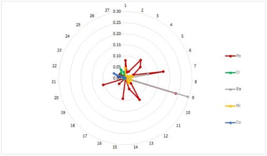 The analysed honey samples were characterised by low concentrations of Pb, Cr, Ba, Ni, and Co, with the identified values being below the limit of detection (LOD) in many samples. As the concentrations of Cd and As were below LOD (0.001 and 0.008 mg/kg WW, respectively) in all tested honey samples, their values are not shown. Hence, only low levels of contamination by these metals were noted. However, Pb was determined in honey samples obtained from 18 sites—namely, Ni in eight sites; Cr in six sites, Ba in six sites; Co in three sites (Figure 2). The presence of Co was found only in honey samples from Warsaw, which were dominated by Pb and Cr.