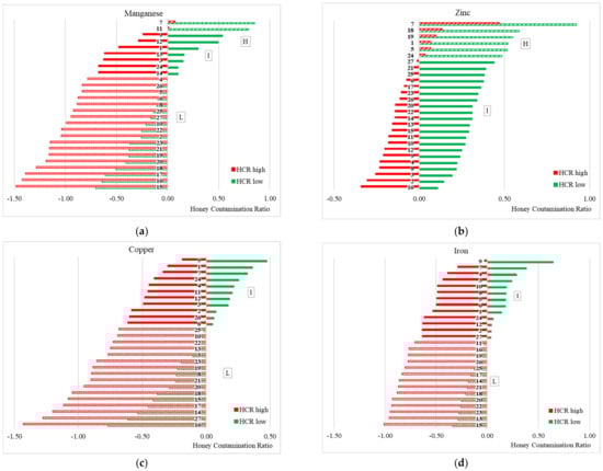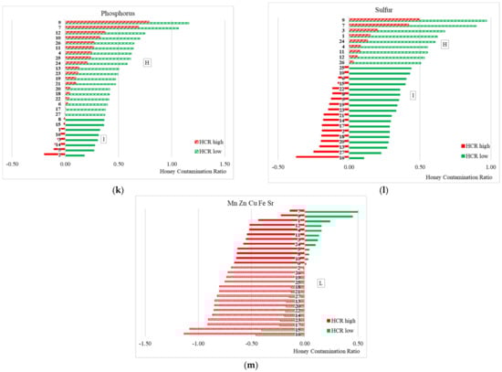 Finally, further insight could be provided by the mean HCR value of five MMs: Mn, Zn, Cu, Fe, and Sr (Figure 3m). Low contamination was detected at 15 sites (56%) and intermediate contamination at 12 sites (44%). Low contamination was observed in 92% of samples from Warsaw honey samples. Intermediate contamination was identified in almost all honey samples from NW Poland.